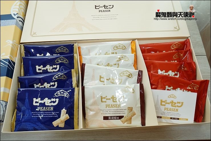 日本橋榮太樓總本鋪米餅使用日本國產米,採用傳統製法製作而成,小小一根沒什麼負擔,一盒裡面共有四種口味:花生X5、海老X4、黑胡椒X2、乳酪X2,我最喜歡海老跟乳酪口味。