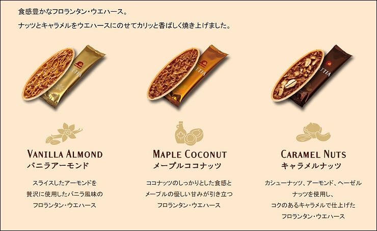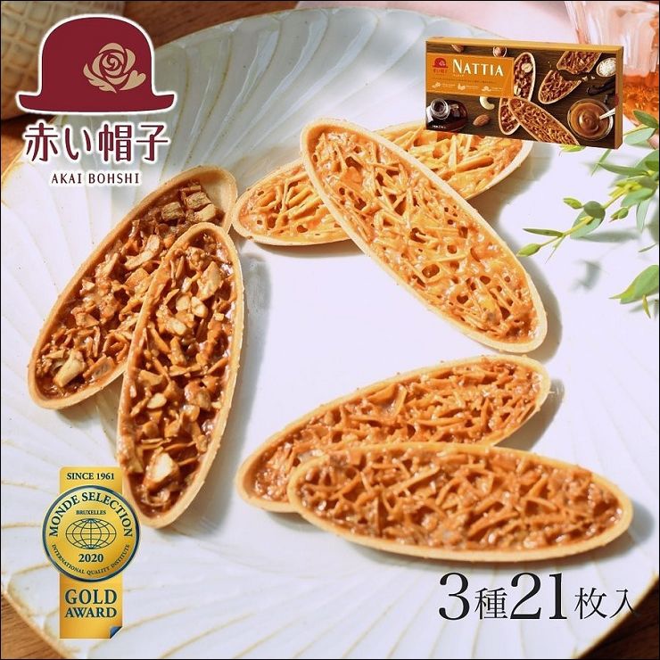 赤い帽子杏仁葉型餅乾是極具知名的喜餅禮盒,其中最受歡迎的就是杏仁葉型餅乾,將堅果和焦糖放在威化餅上,酥脆香。這款禮盒組搭配了三款口味,香草杏仁X9枚、楓糖椰子X6枚、焦糖堅果X6枚,其中二款是連喜餅也沒有的喲!