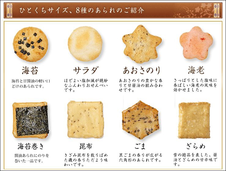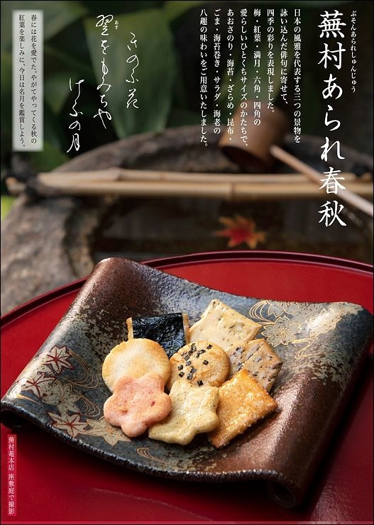 這家六角蕪村菴也是京都知名餅鋪,這可是貴婦朋友到京都必買的伴手禮之一,聽說完全不會輸給在台灣知名度較高的小倉山莊(可惜社長沒收到,泣),8撰餅乾禮盒組呈現了四個季節的色彩,融合了日本三大最著名的景點,8種內容物分別是:海苔醬油、鹽口味、醬油、海老、海苔捲、昆布、芝麻、辛醬油。