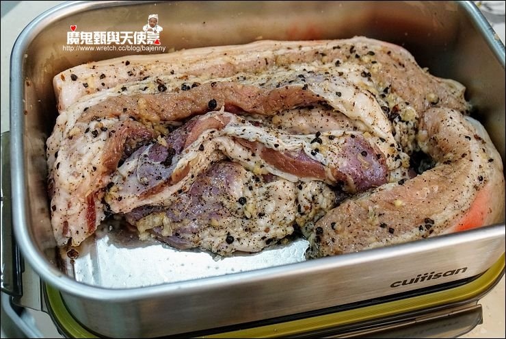醃料抹在肉的部份,豬皮要保持乾燥,豬皮朝上放入保鮮盒,放在冷藏1~3天。