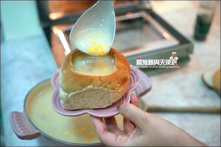 麵包玉米濃湯是每次去平價牛排館最期待的,麵包買回家自己挖空,放入422氣炸烤箱180度烤5分鐘,再盛入煮滾的玉米濃湯撒上黑胡椒,小朋友一定會喝光湯再把麵包扒光光!!