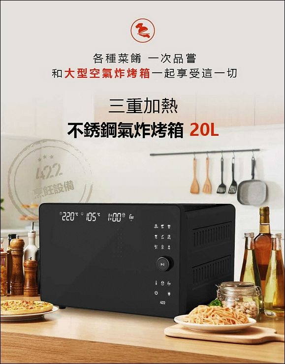 422史上最低價最殺最優惠就這檔⚠️搶現貨付款完成快速出貨,母親節最佳禮物就是422,尤其今年又新推出422的20公升旗艦機種,簡直不受限帶你放飛,當然怎麼飛就憑個人想像無限創意XD。社長這幾年開團422周圍好友們都淪陷,大家都是樓上揪樓下,阿公揪阿嬤~吃好逗相報的意思,允嘉阿嬤還揪了廟裡的好姐妹一起。先要跟親朋好友們說SORRY!422新上市的旗艦機種20L,超美更大更威更好用,又要讓大家掏錢了。 因為它 #功能進化、#外觀進化、#容量進化! 等於擁有最強廚房神器。之前礙於空間或火力不能做的料理,現在大烤箱可以做的通通都可以盡情發揮,之前氣炸大全雞13L無法旋轉(只能躺著氣炸),20L可容納兩公斤的大雞很好轉(在旁邊聽到滋滋作響的聲音超療癒),氣炸時間縮短一樣大爆汁!!之前專業餐飲師字輩的好友都大誇13公升已經神厲害了!!他們如果用到這台又要甘拜下風了。尤其烤箱用完擦一擦就好,再也不用苦命刷爐台。很多人都是自己試用後再推薦給家人朋友,如果最近有搬新家計畫或要想要淘汰家中舊烤箱的別錯過,溫馨提醒大家:母親節要到了!!越早下單越早收到。這台42213L社長也試用了快五年,好用不在話下(各大氣炸鍋社團狂推不已),所以一直在缺貨狀態中,422 AIR FRYER AF13L氣炸烤箱奶油色社長這兒有少量現貨,售完不預購喔!限定色美美的光是擺在中島看了就有好心情~~姊妹家的大二女孩也是資深阿米,向來廚房不邁二步,瞧見限量奶油色也開始對料理有了興趣,最近炸雞塊薯條上手得很(是時候再進階一層了啦XD),這台不止美型好看,強大功能更是得到專業高商西餐主任的認可,她說身邊不少朋友在等著入坑。另外原廠也有付費貼心送洗服務(記得保留原廠外箱),社長建議每年都定期送廠保養一下,這樣才能用的更久(今年20公升全黑鏡面酷帥極了)。