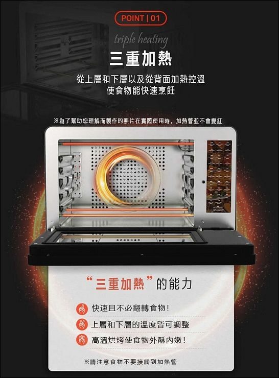 ☑業界首創三重加熱,帶來更快速且均勻的烹調效果,再也不用頻頻翻面,高溫烘烤更使食材外酥內嫩!