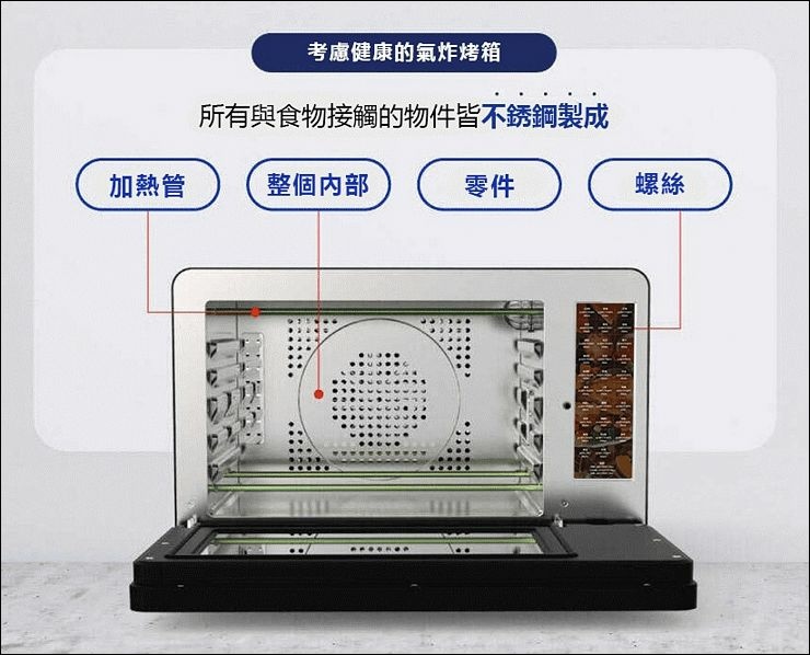 全機不銹鋼(含機身外殼,內部墻體,門框內部,門框外側,內部邊框,加熱管,熱風旋轉風葉)
