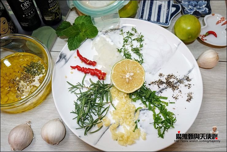 洋蔥、蒜頭、檸檬、薄荷、迷迭香、辣椒、橄欖油、黑胡椒、海鹽、義大利香料