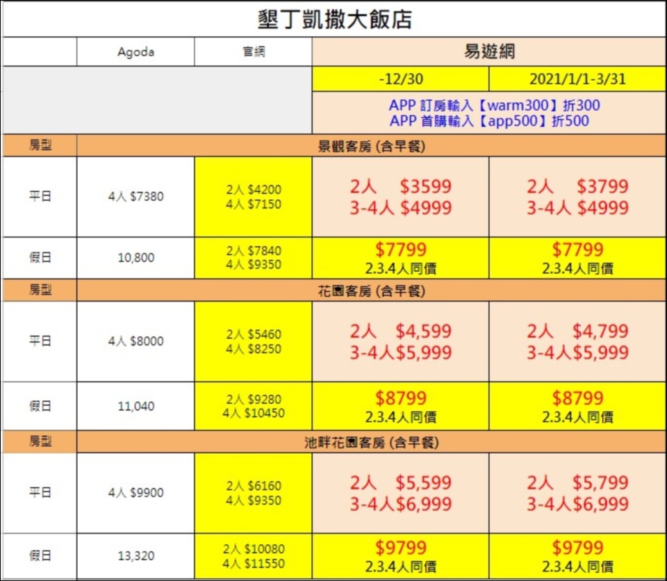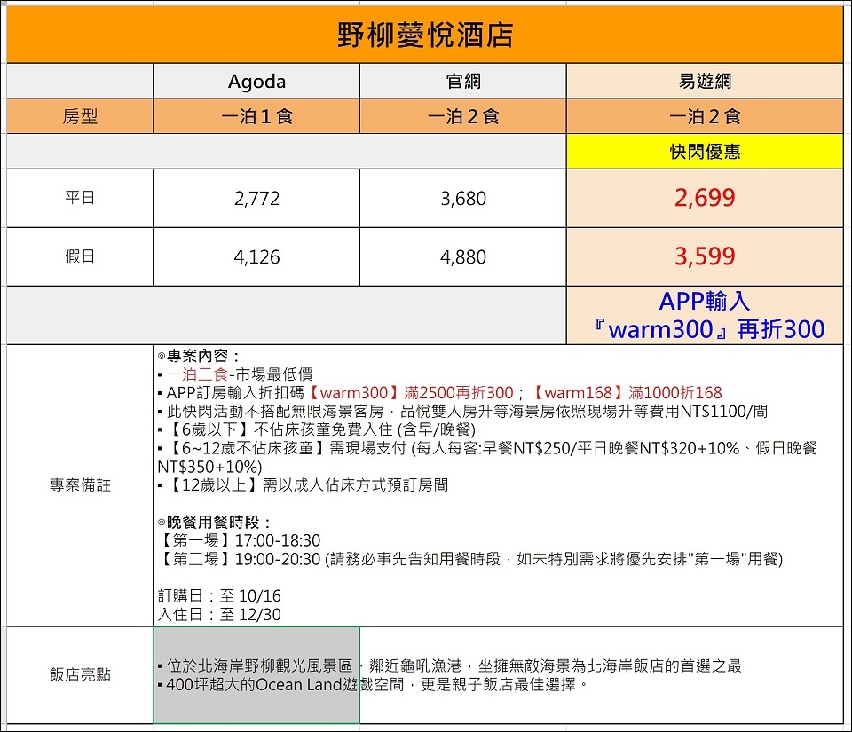 ※此為易遊網和墾丁凱撒大飯店、薆悅酒店野柳渡假館聯合提供的限時快閃專案,訂房需要先加入易遊網會員,可連動FACEBOOK與GOOGLE帳戶快速加入,可使用國旅卡,訂房亦享有易遊網高鐵票價79折優惠,APP訂房輸入『warm300』再折300元!國旅大爆發熱門飯店供不應求的情況下,連續好幾個飯店提供的專案優惠都達不到開團標準,這次透過易遊網爭取的獨家優惠專案談的不容易,請大家多作功課覺得飯店風格適合自己又有優惠到再訂房,希望大家都能用最經濟的價格留下美好珍貴回憶xd