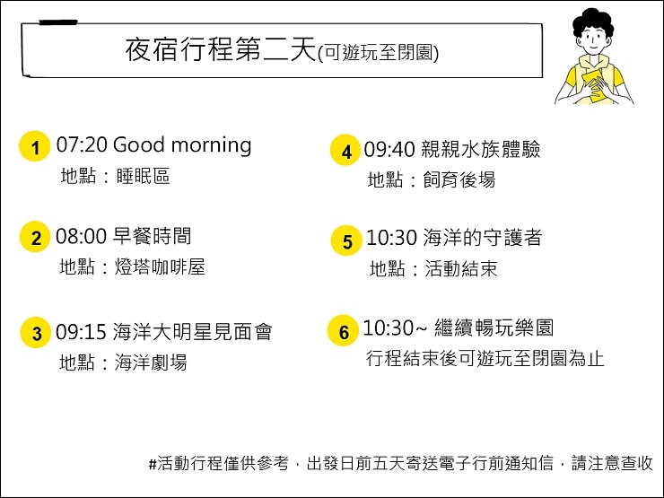 📣第一天最晚需13:30以前海洋公園報到(也可提早入園遊玩),行程一直到隔日的早上10:30結束,其餘時間皆可停留在海洋公園觀賞表演及玩遊樂設施。