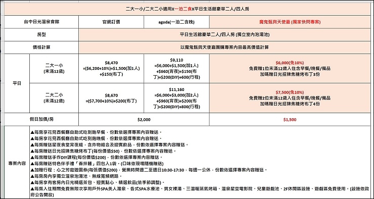 11.假日每房加$1,500(假日加價原價$2,000),寒假平日入住不加價。平日定義:週日至週五;假日定義:週六或國定假日及連續假期(春節期間不適用),加人費用$1,500/位(含房內備品、早餐、晚餐與贈送專案票券)。