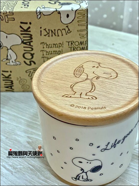 日本製SNOOPY史努比經典人物馬克杯+杯蓋組,這組附有木頭杯蓋,也可以當杯墊適用,而且杯身的兩面圖案不一樣喔!!
