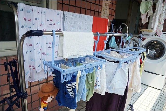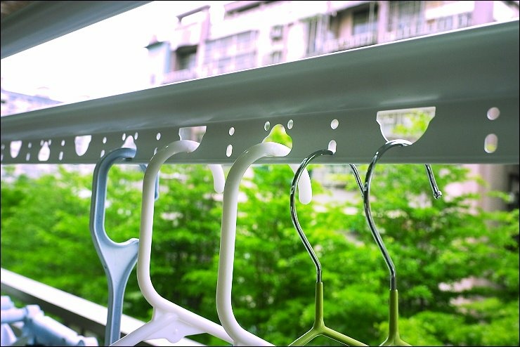 小姑我家裡有三個落地曬衣架,沒輪子的XL型、二個雙桿晒衣架,又重又大又佔空間,白天後陽台晒不乾,下午又要乾坤大挪移搬到太陽晒到的前陽台,天氣好也就算了,天氣不好就更麻煩,怕衣物淋溼還得搶時間全都再移到室內,搞的很像在打仗很累人...