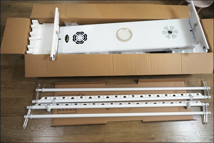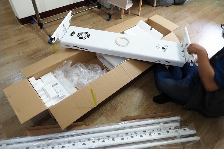 室內進行機器初步組裝!我原本是在和成的「旗艦烘乾款」和「豪華四桿款」二款掙扎要訂哪一款,「旗艦烘乾款」是目前HCG的最頂級款,全台首創曬衣烘衣二合一的電動曬衣機,可以烘乾,很適合常下雨的北台灣!!!不過,我最後選擇「HCG和成電動曬衣機豪華四桿款」,因為它有紫外線殺菌燈及風扇可依據曬衣需求做分區晾曬,很適合我們家的過敏兒;在現在這個後疫情時期,可以殺菌也讓媽媽我很安心。外型的部分,一體成形的鋼琴烤漆大加分,美到翻掉!