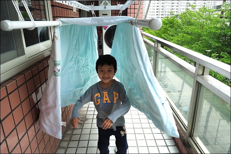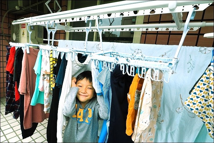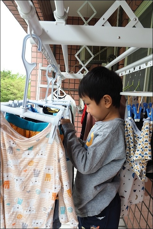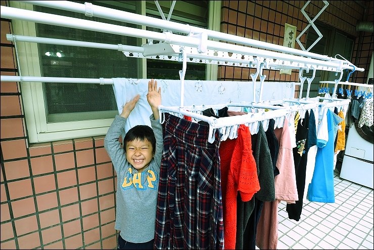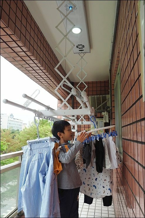 以前後陽台的落地曬衣架不但佔空間也比較高,小弟都只能幫我把洗衣機的衣服拿給我來掛,而現在安裝了HCG和成電動曬衣機豪華四桿款之後,小弟都能幫我曬衣服跟收衣服了,洗衣曬衣不再是媽媽一個人的家事,孩子也能輕鬆幫忙囉!