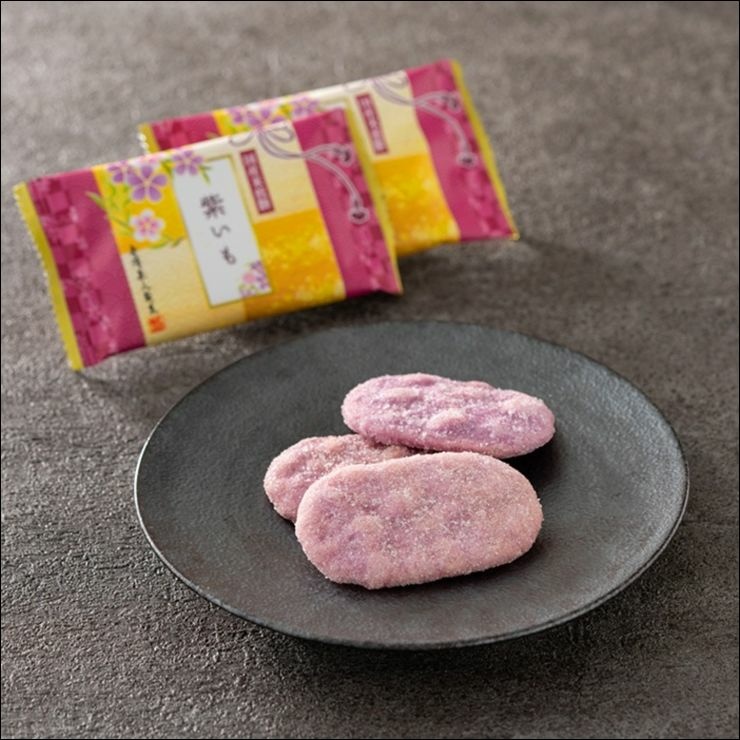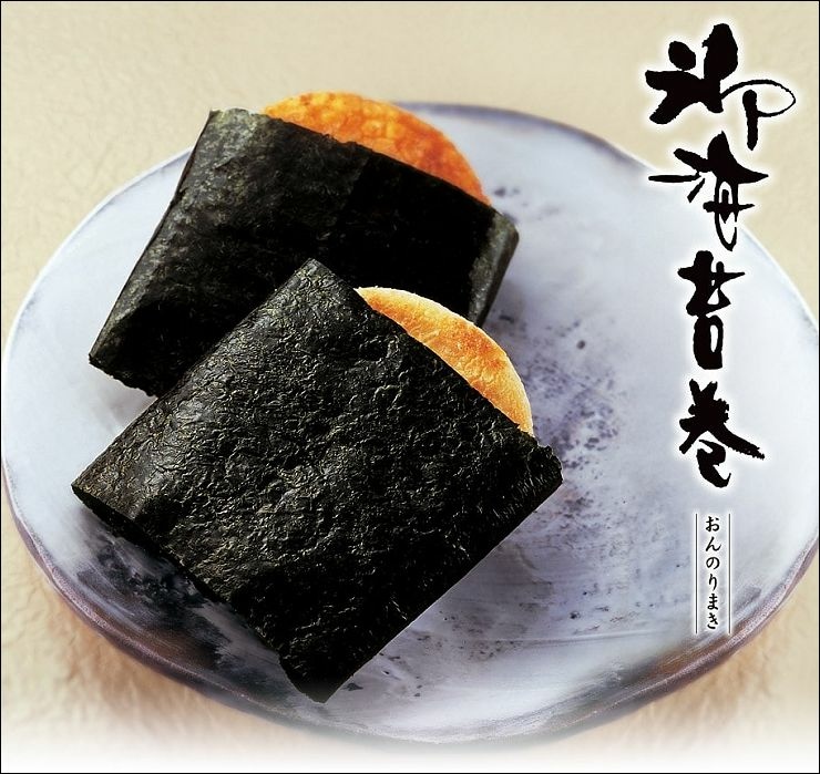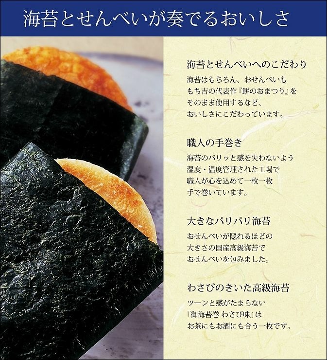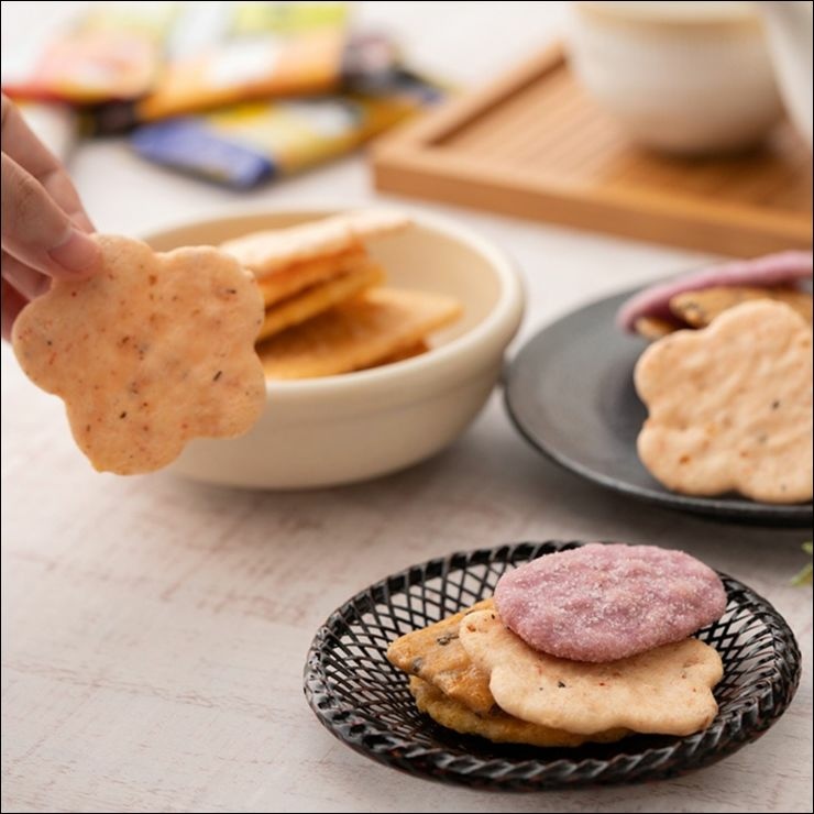 使用日本100%國產米+日本在地產海苔,製作出醬油口味與芥末口味的米菓,可以享受醬油與芥末口味的鹹甜辣口味,並且享受仙貝酥脆的口感。