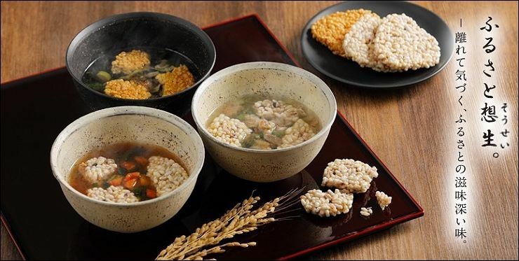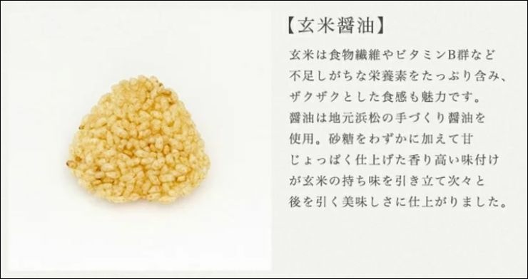 用糯米和玄米製成的米果。玄米含有大量的營養成分,例如膳食纖維和維生素 B,其鬆脆的口感也很有吸引力。使用的醬油是日本當地手工製作的醬油。香調,加入少量砂糖,製作出高級感味道,並且增強玄米的風味,使玄米更加美味。
