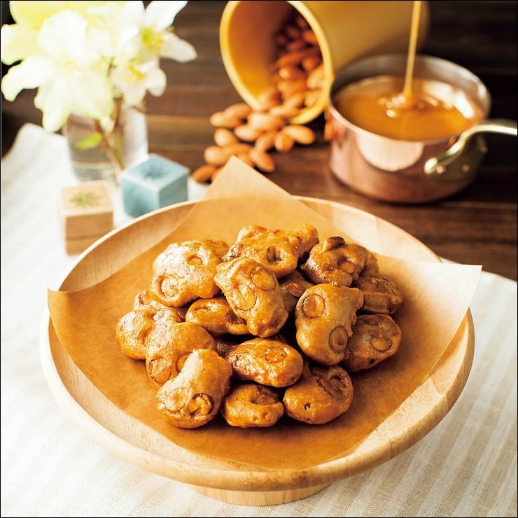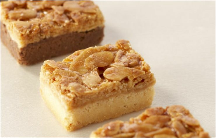 焦糖杏仁:優雅高檔的麵包塊搭配焦糖塗層與切片杏仁,可以享受到酥脆的杏仁和酥脆麵包口感,焦糖在口中散發濃郁香味與杏仁達到完美平衡。