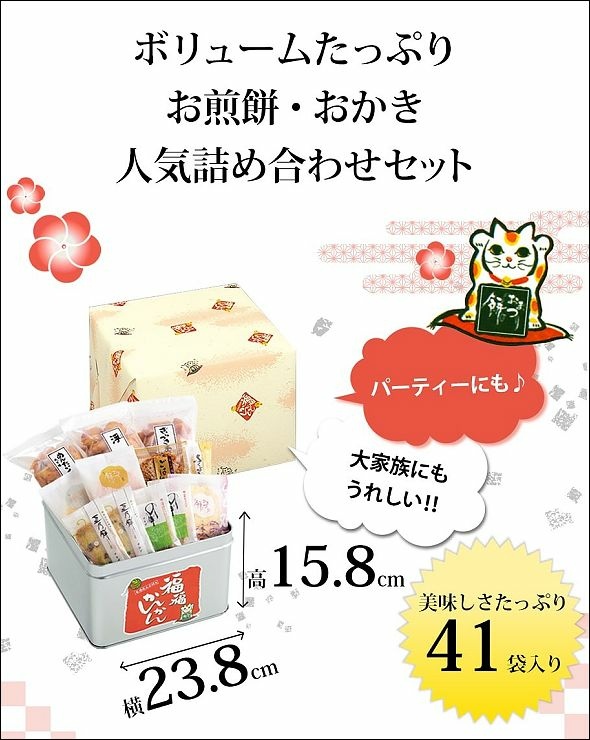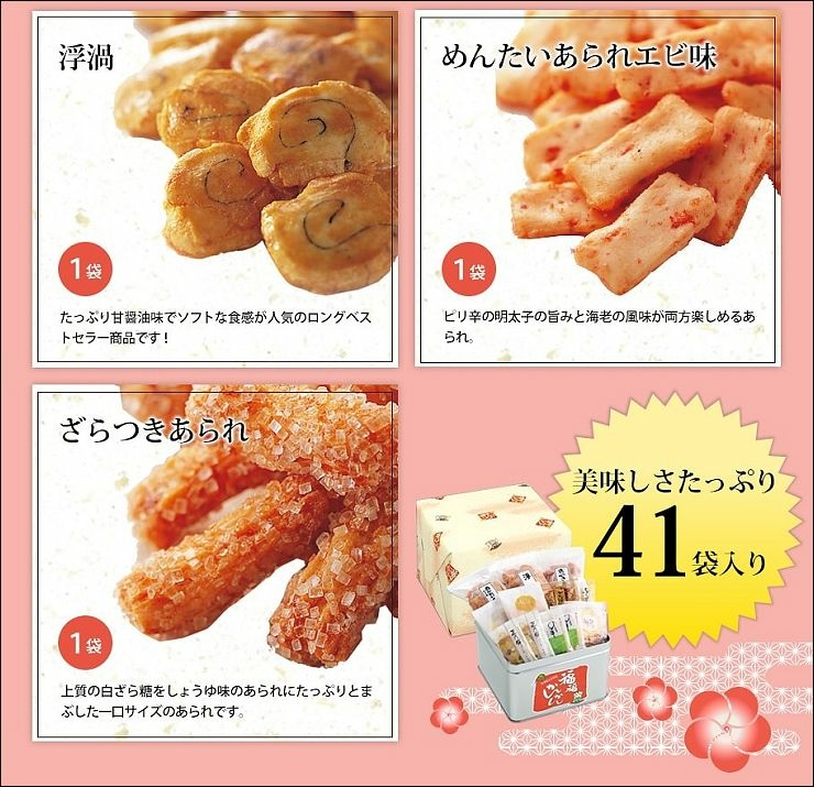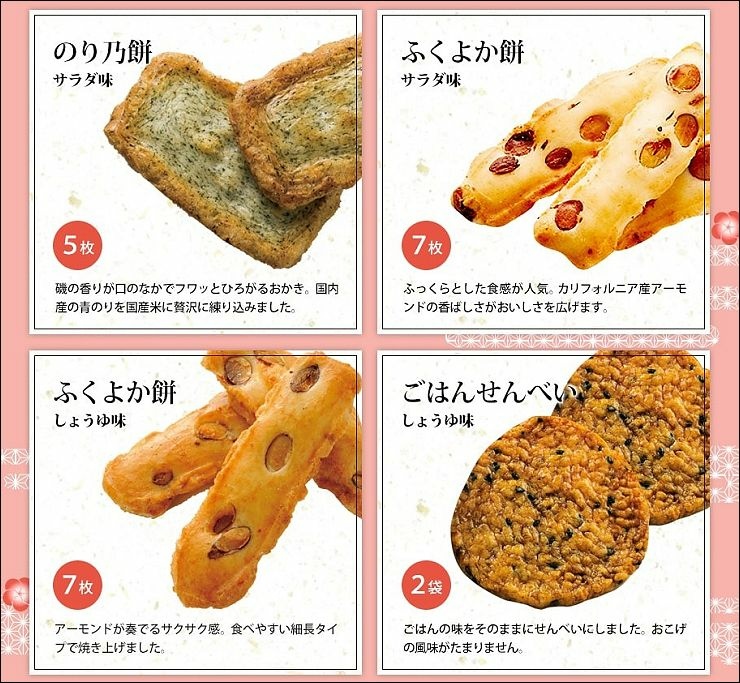 內容 : 醬油仙貝X5、沙拉仙貝X5、梅子仙貝X2、黑豆仙貝X5、海苔仙貝X5、杏仁沙拉米菓X7、杏仁醬油米菓X7醬油米餅X2、浮渦醬油米菓X1、明太子蝦米菓X1、糖醬油米菓X1