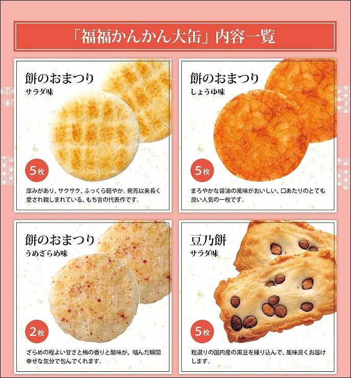 日本望吉mochikic 福鐵盒限定版綜合米菓禮盒組,使用日本100%國產米,製作出各種不同風味的米菓與仙貝,可以享受鹹甜的鹹香酥脆口感酥脆口感。