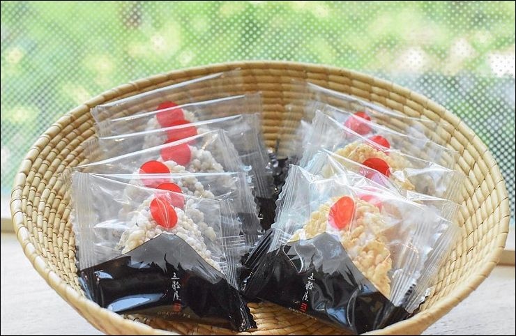 五穀屋富士山飯糰米餅禮盒組包裝展現象徵日本的富士山的寧靜力量和水面微微倒影的富士山。高質感紙包裝,非常適合送禮!!