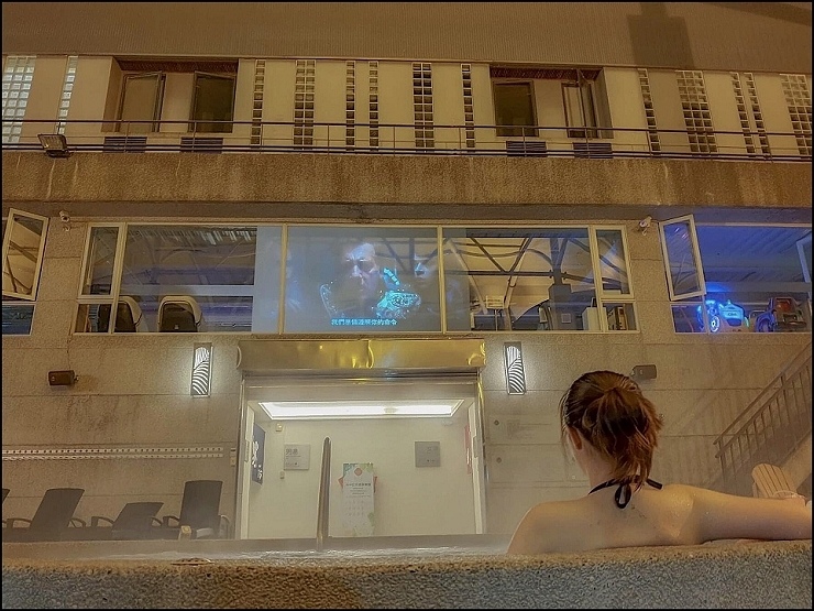 以前只有在花蓮太魯閣晶英和宜蘭礁溪晶泉丰旅看過星空電影院,想不到中部陽明山上的台中大坑日光溫泉會館也可以邊泡湯玩水邊看電影。