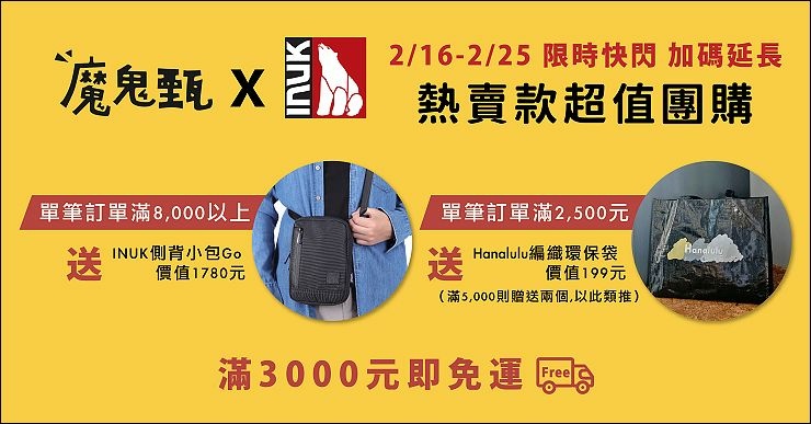 滿3000元以上免運,單筆訂單滿2,500元,即贈送Hanaluluu品牌編織環保袋(價值199元,滿5,000則贈送兩個、以此類推),單筆訂單滿8,000以上,送inuk側背小包go價值1780元。