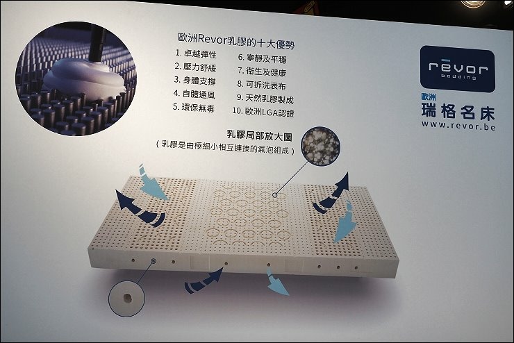 Revor瑞格最厲害的就是它的乳膠,有歐州LGA認證,天然乳膠製成、自體通風、環保無毒壓力舒緩、身體支撐等十大優勢。瑞格「赫爾曼」表布為土耳其cooler冷暖布,冬暖夏涼很舒適。獨立筒彈簧,主要襯材為記憶膠、超高護邊透氣棉、高彈力乳膠泡棉,整張7公分的記憶膠,躺感偏硬,但身體是可以釋壓的,尤其睡在旁邊的伴侶翻身干擾極低!
