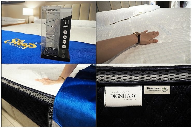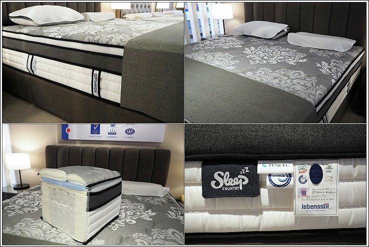 Sleep Country睡眠王國自有品牌這款「極致尊榮」,彈簧是鈦合金獨立筒袋裝彈簧,提高支撐、彈性加分,使用土耳其冰紗纖維表布,冬暖夏涼、透氣舒適,還有3D透氣網布,用力壓下可是會有空氣跑出來,讓床墊可以透氣呼吸,試躺感覺真的涼爽又透氣,床算中度軟硬度,試躺時覺得腰部有被支撐、身體好放鬆,隔天起床身體的輕盈感一定很棒!