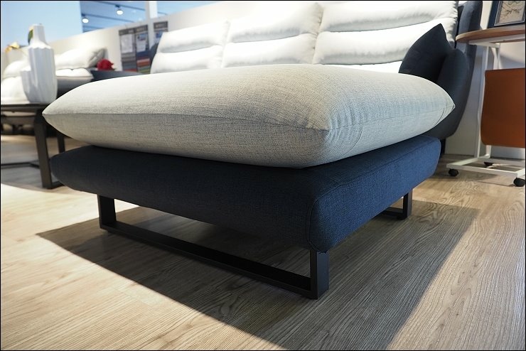 舒芙蕾有三色,除了上面的淺色系之外,還有深灰及這個深藍搭淺灰的跳色組合。椅腳也可以視個人喜好選搭實木腳或是金屬腳,另外,坐墊也可客製為一整片(中間不車線)。