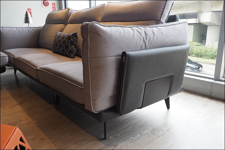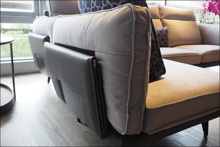 這款維納斯機能布沙發也相當有質感,特別的是,這組的腳椅有做背靠,升級為「側椅」,家裡若有客人來人多時,這張腳椅可以化身為側椅,讓人坐了也舒服!沙發椅背及側邊設計了皮革及拉鏈造型設計,增添復古味,質感也升級,友人笑說拉鏈打開可以藏私房錢,小姑家小弟說他可能會拿來藏考卷,超爆笑。