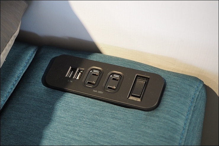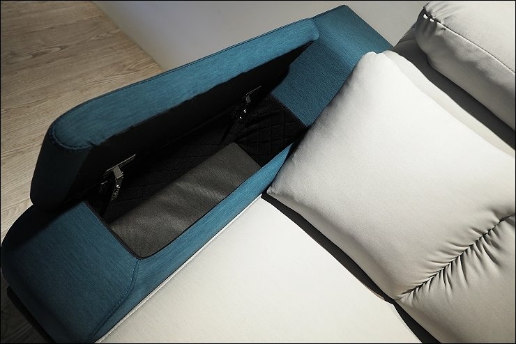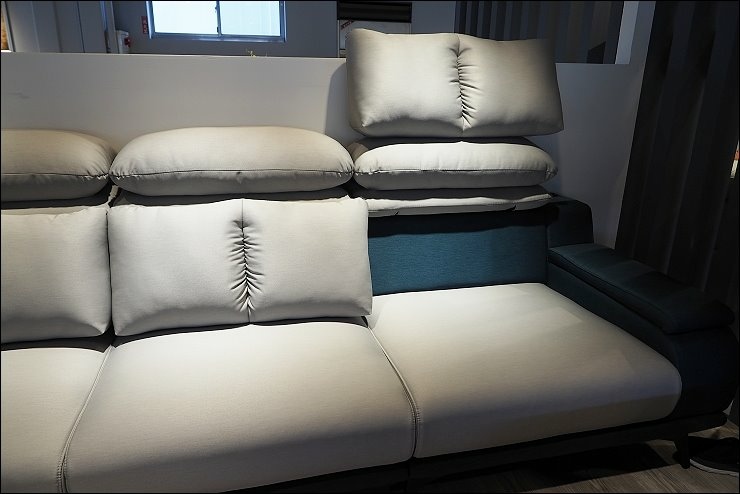 西堤機能布沙發外型簡單大方,配色很跳!可調式頭枕、背枕可自由移動,使用上更有彈性,扶手有收納功能,也有緩衝設計,右上方有USB及插座各二個。
