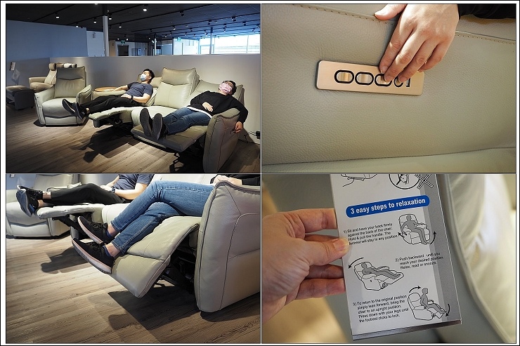 全能休閒椅是進口義大利全牛皮製,符合人體工學的設計,身體背部到大腿都能緊貼,包覆性很夠,連靠枕也能調整高度,腳身直跨在單椅上,非常舒服又放鬆,可以看雜誌聽聽音樂,我則是覺得躺著舒服直接睡個午覺剛剛好,很適合家裡有空間放,買回家孝敬長輩,老人家邊看電視邊打盹超放鬆。左至右Viva2、Angelo 2、Leone2三款,每張坐起來還是有些不同,我個人喜歡紮實一點的躺感,朋友則是喜歡較軟的舒適度,躺過才知道身體喜歡哪一張。