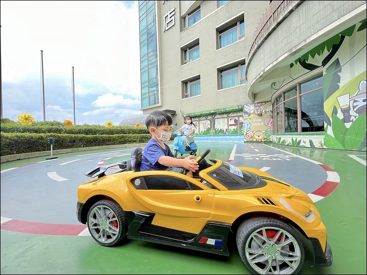 ★這次剛好選定於飯店內親子遊樂空間(FUN世界)全新整修後首波優惠,飯店除了有室內大彩虹球池外,特別的是還有露天賽車場,滿足喜歡開車車的小朋友,而這次專案也有特別贈送電動車券1張,及DIY課程,都可以讓小朋友玩到不行。