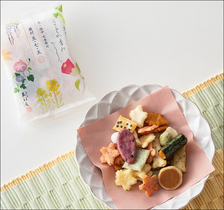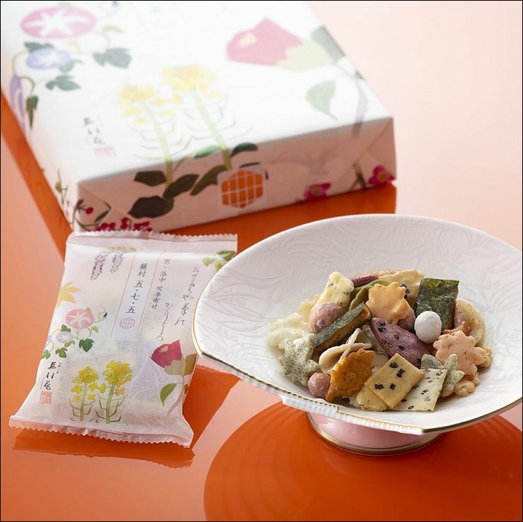 日本蕪村庵四季綜合米菓禮盒,以四季花鳥風月為像徵的季節外觀被製作成櫻花和紅葉等不同的形狀