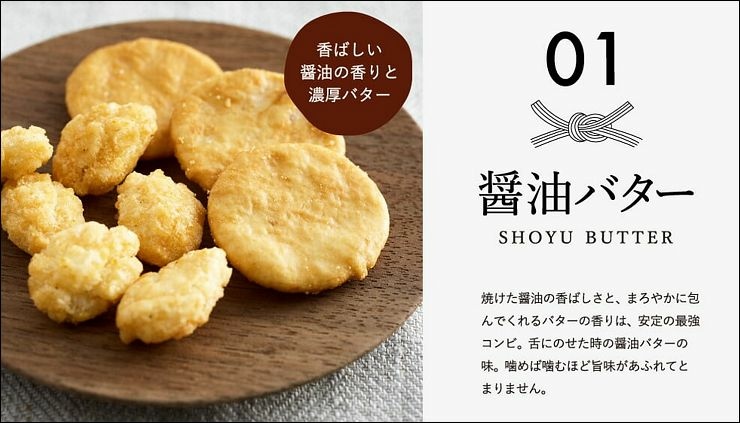 由日本國產大米製作而成四種仙貝,純國產製作的米菓吃過就知道了,放進嘴裡的那一刻,白米飯的香味就像剛煮好的米飯,越嚼越香。