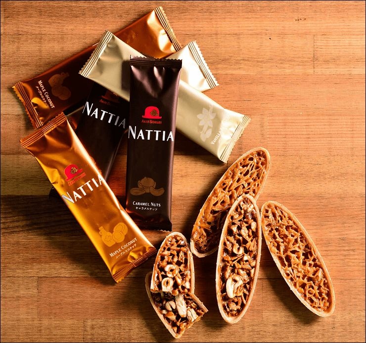 將堅果和焦糖、杏仁放在威化餅上製成,它又脆又香是赤い帽子受歡迎餅乾之一。