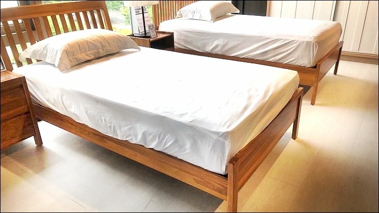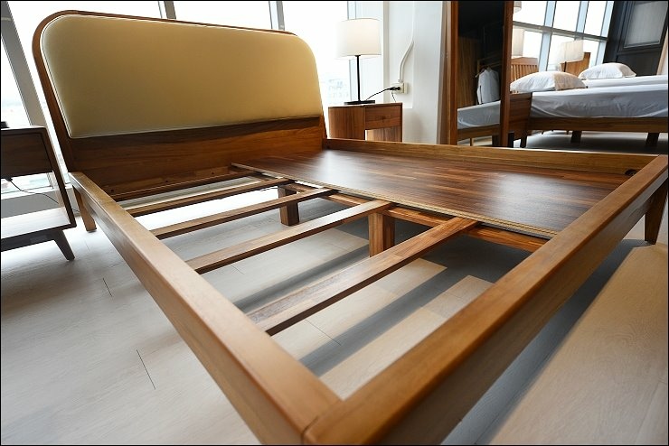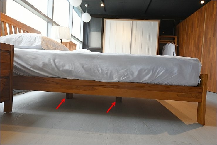 雙人床台的底不是單薄的板子(一般稱排骨架),連排骨架都是使用柚木材質木板,床體結構使用方榫和三角榫接的固定技術,加上中間有中心桿,底部還有第5支、第6支腳,加上床板,整體結構很穩固,放上彈簧床很穩很牢靠。
