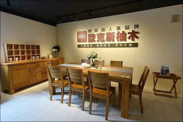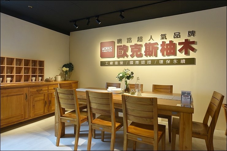 歐克斯家居台北旗艦店以柚木為主,展示陳列各式柚木家具,餐桌、床台、沙發、茶几等柚木傢俱,經過服務人員的解說,能更進一步了柚木的好壞及製作方式、工法,在在都是影響柚木家具的品質!WORKS歐克斯家具從產地到客戶,使用的柚木原木是35年以上樹齡、拼接工法符合歐盟認證,塗料也有合格認證,WORKS歐克斯整間店是舒服淡淡的柚木香,多元家具組合,創造原木實木溫馨感氛圍,提供更好的品質,最優惠的價格!讓大家輕鬆打造時尚品味居家生活,擁有屬於自己的夢想家!