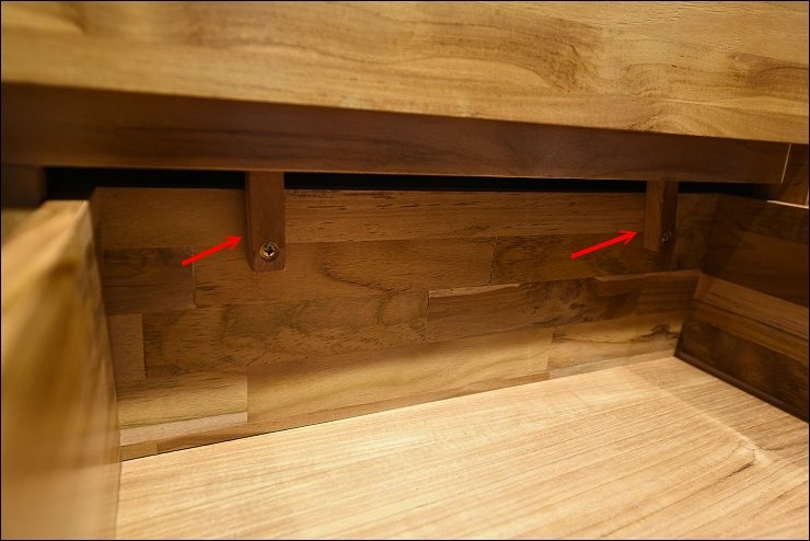 魔鬼藏在細節裡!拉開抽屜完全沒有五金滑軌,百分百全木製!使用䲪尾榫接技術,較為費工,但更為牢固!抽屜底部還有做可調整卡榫,平時使用不會抽屜失手整個掉下來的窘境。歐克斯傢俱連抽屜裡的小細節也都很仔細!