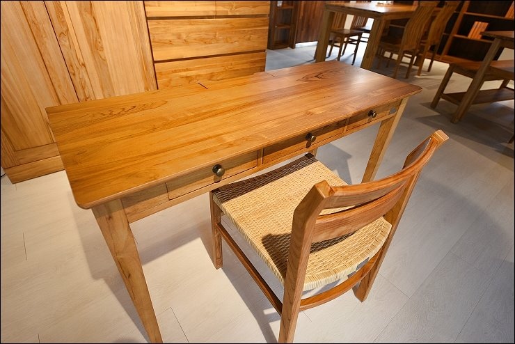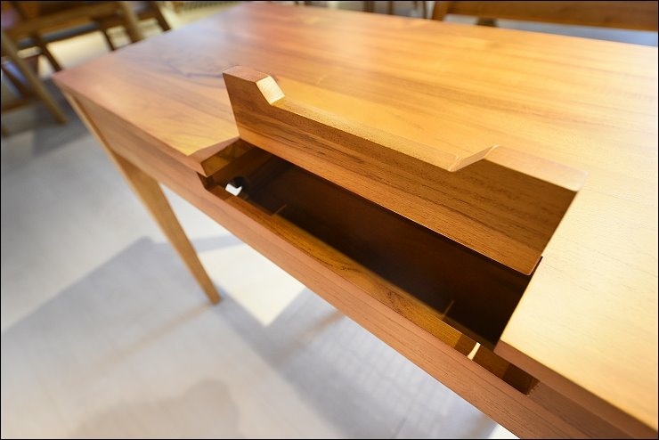抽屜一樣是柚木實木,沒有五金滑軌,桌面只有一處設計電線收集合,電腦電源線、手機充電線、檯燈線都可以通通收在這裡,桌面整齊不凌亂。