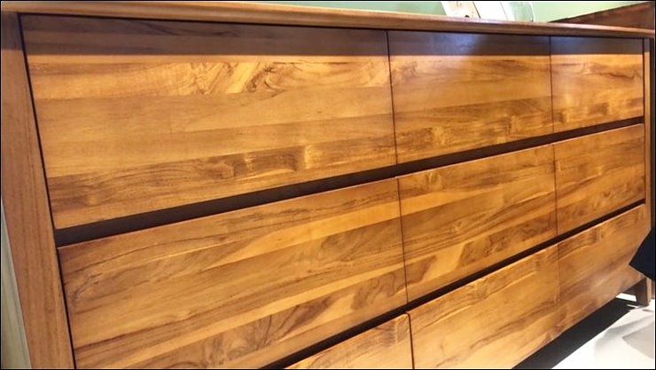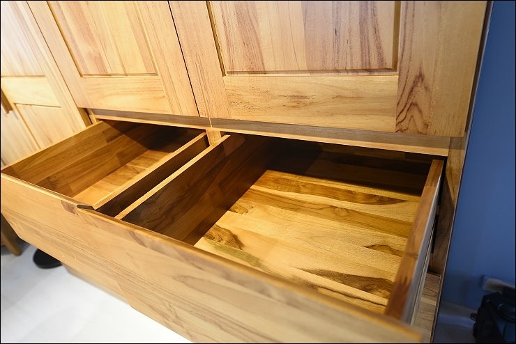 斗櫃看抽屜有幾格就是幾斗櫃,最受歡迎的多為五斗櫃及六斗櫃,仔細看,橫向抽屜使用同一塊柚木,木紋銜接細節都有注意,整體視覺也很好!打開抽屜層,板材也都是使用柚木,真材實料全柚木製成的櫃子,質感一級棒!