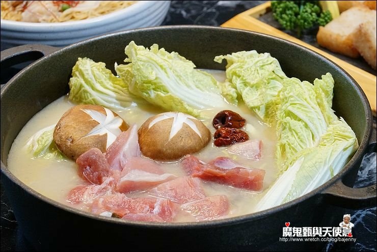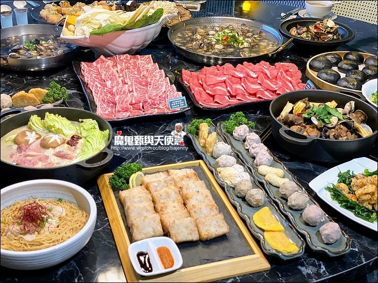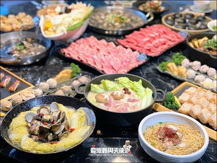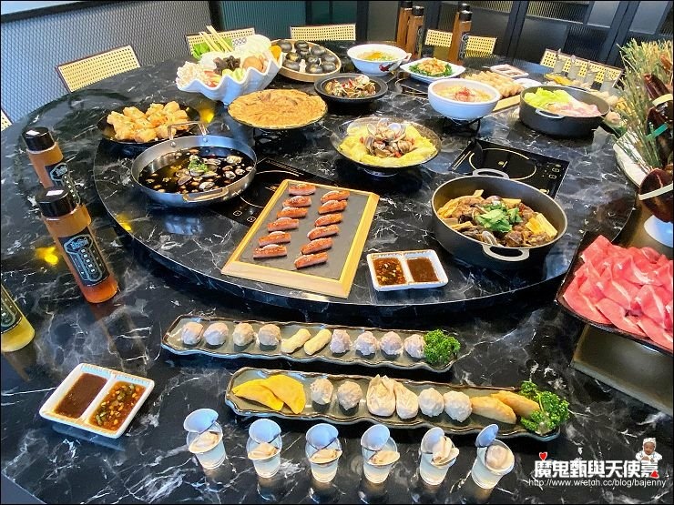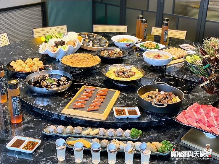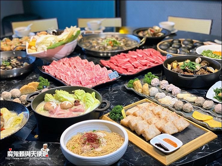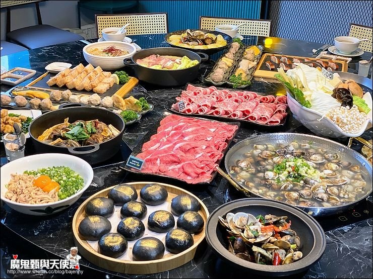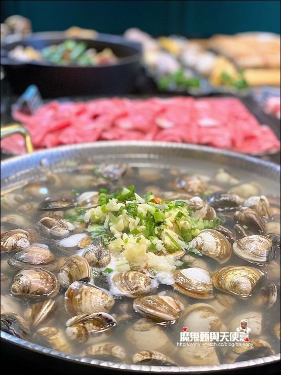 除了配料一堆,湯頭也很多元化,除了翠玉瑶柱雞白鍋,還有正宗原味卜卜蜆、港式雞煲、新創黑蒜卜卜蜆等,肉片可以隨喜好放各鍋煮食。
