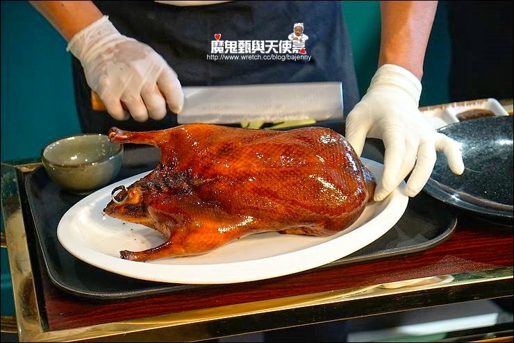 以獨家秘方遵循古法倒立式歷經三日醃製而成。外酥內嫩,帶點粉色的肉汁不柴不老,肉質鮮美。在嚴苛的把關下,每三到四隻鴨中才能挑選出一隻完美的櫻桃片皮鴨。