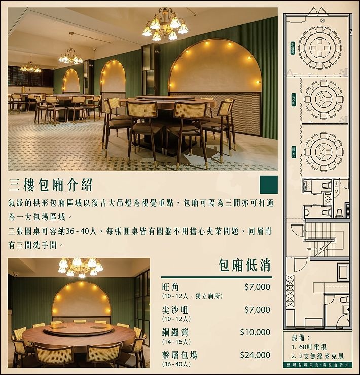台中公益店三樓是包廂區(包箱有低消),偌大圓桌分三間可容納36-40人,也可打通,圓桌還設有自動轉盤,方便大家夾菜。