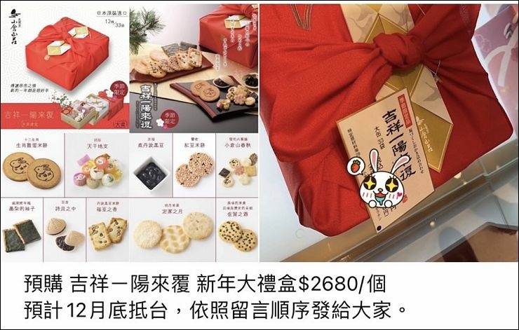 又到了日本餅乾過年送禮精選團,雖然國門已經解封大家陸續在飛了,但很多禮盒你在日本當地是買不到的(不是大排長龍就是有限購令喔)。大家真的不要這麼累自己去搬去扛,省不了多少錢,還買不到喔!!重點是我們可以刷卡、有發票還幫你宅配到府,其中台灣人最愛的小倉山莊禮盒記得先搶,社長不小心發現日本代購小倉山莊的新年禮盒是天價‼️‼️竟然比我們的團購價貴900欸,而且小倉山莊有限購令,這款吉祥一陽来復小倉很不好買,雖然單價高但現場幾乎不給訂了,可能是因為這樣他們單價才敢開高(物以稀為貴),就連小盒的也有價差喔!!另外六角蕪村菴也是京都知名餅鋪,這可是貴婦朋友到京都必買的伴手禮之一,聽說完全不會輸給在台灣知名度較高的小倉山莊,大家可以依喜好或預算選擇。大家最愛的法蘭酥系列也在這次名單中,要知道小孩對於法蘭酥根本無法抗拒,尤其是日本的法蘭酥口感又更不一樣,分紅盒跟黑盒,小孩才做選擇,建議就是1+1通包省煩惱,紅盒是抹茶、紅茶、咖啡(我超愛咖啡口味),黑盒是草莓、香草、巧克力,這個系列完全是小朋友的菜,妹妹一口氣吃了三種口味的法蘭酥大呼過癮極了(她最愛香草跟巧克力),去年賣到翻的紫/綠/紅三色鐵盒絕對是自留款,鐵盒美內容物也好吃!!社長覺得紫盒蘭姆葡萄夾心餅乾最好吃但保存期限最短(建議自留),好姐妹大推紅色喜氣的千層巧克力,新品有信州富士蘋果烤蛋糕禮盒、日本東京車站限定巧克力夾心餅乾禮盒、名古屋限定達克瓦茲綜合夾心餅乾禮盒、名古屋限定船型派蛋糕禮盒、赤坂柿山綜合仙貝米菓禮盒組等,有鹹有甜種類不少,相信大家都可以選到體面好吃的禮盒,除了送親朋友好別忘了留一些自肥喔。為了確保產品都是最新製造,過年禮盒採預購方式,預計在過年前三周寄出(12月底開始出貨),到時都是最新製作的一批(但仍需要扣除包裝、集貨、運送的時間,差不多要抓3~4周的時間),效期比較短的收到可能只剩一個月的時間(如蘭姆葡萄)。由於每款餅乾保存期限不一,請大家收到後務必留意保存期限,還有每一款都會另外附提袋,方便大家送禮。