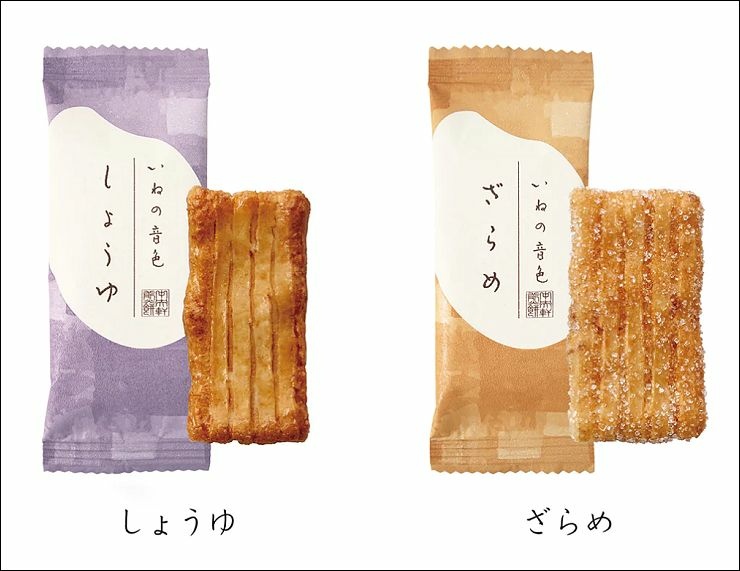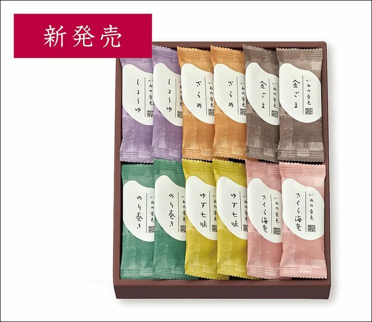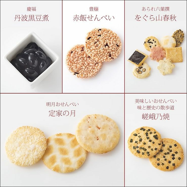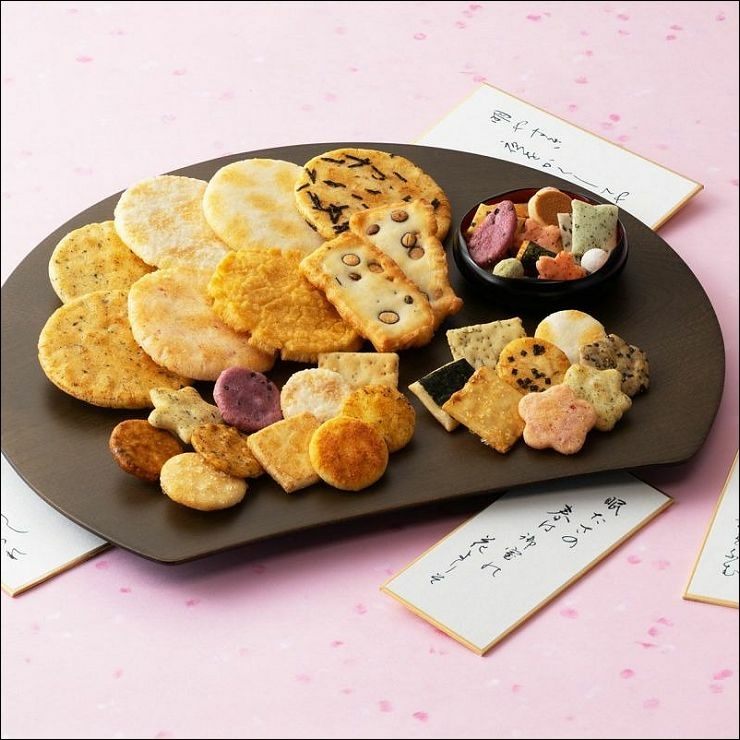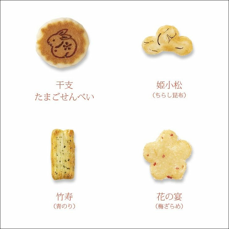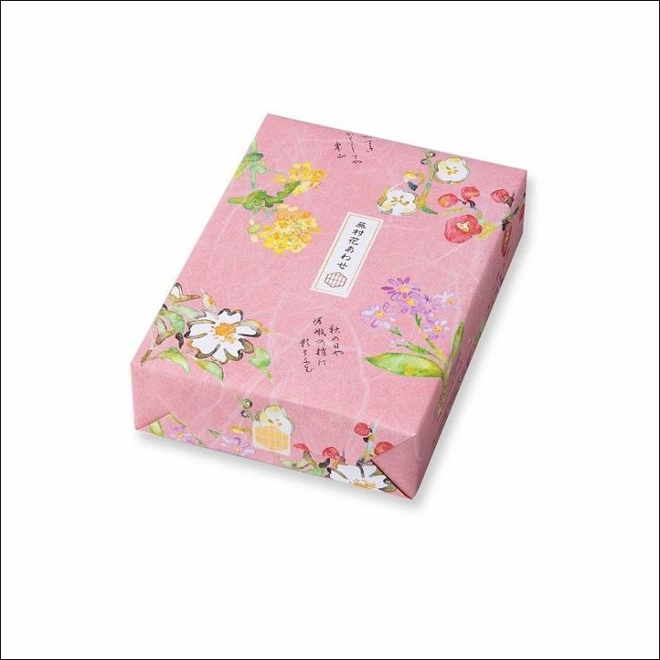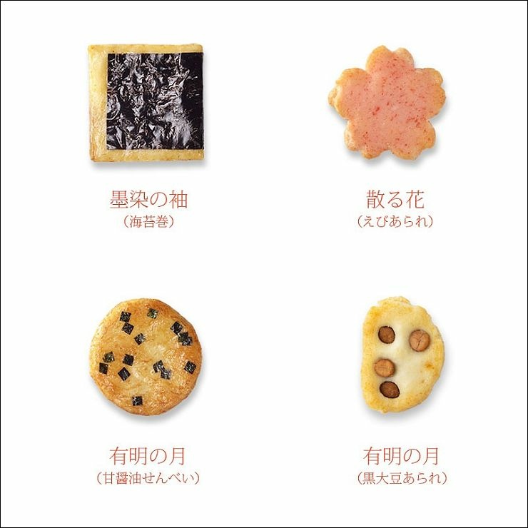 四個季節的顏色用詩句來表達,描述了三個代表日本優雅的景點。八種可愛的米菓,秋葉,滿月,六邊形和正方形,帶有海苔,海帶,海藻,蝦和芝麻等有趣的口味。