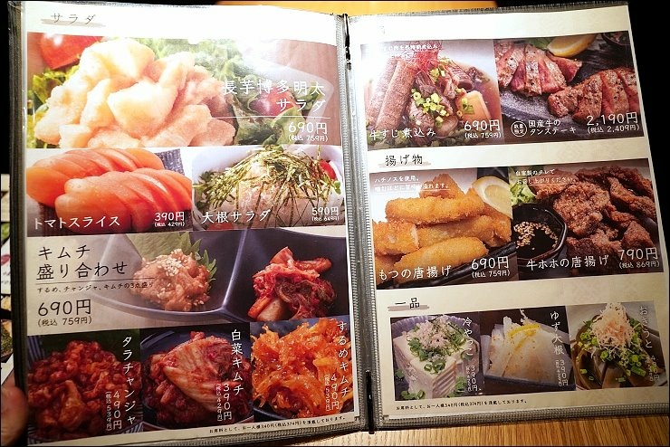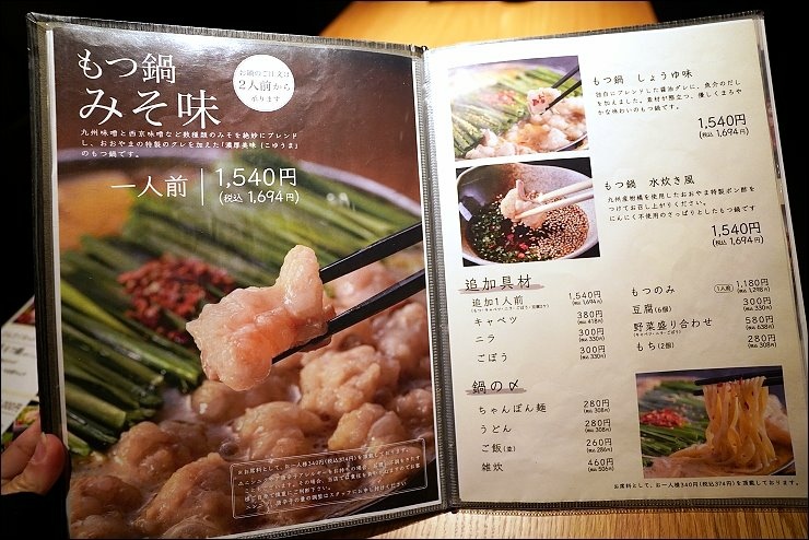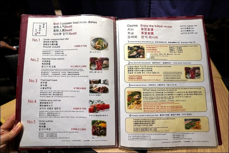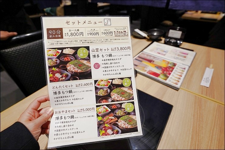 菜單有一人起鍋或二人起鍋的牛腸鍋套餐或是其他單點菜色,我們點大山套餐博多牛腸鍋:5000円(2人起鍋),套餐內容包含牛腸鍋、山藥博多明太子沙拉、生馬肉拼盤、國產牛舌排、柔嫩醋牛腸、白菜泡菜、餐後強棒麵。