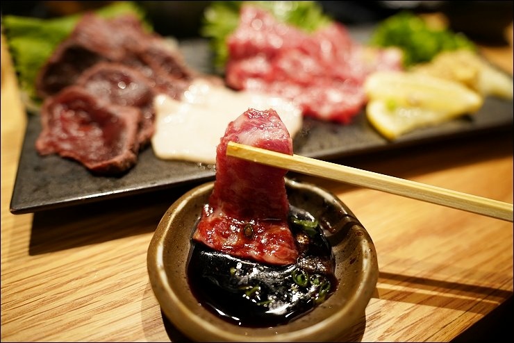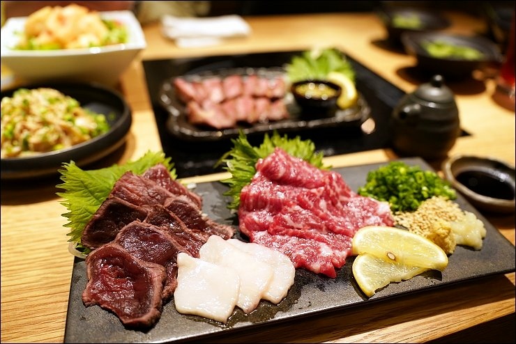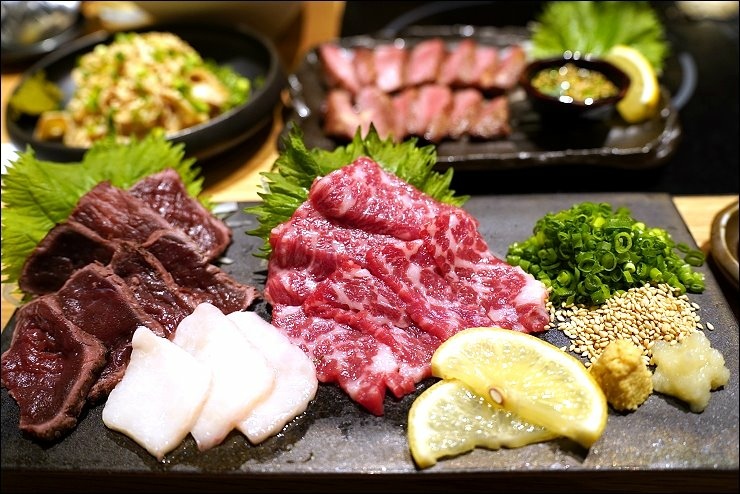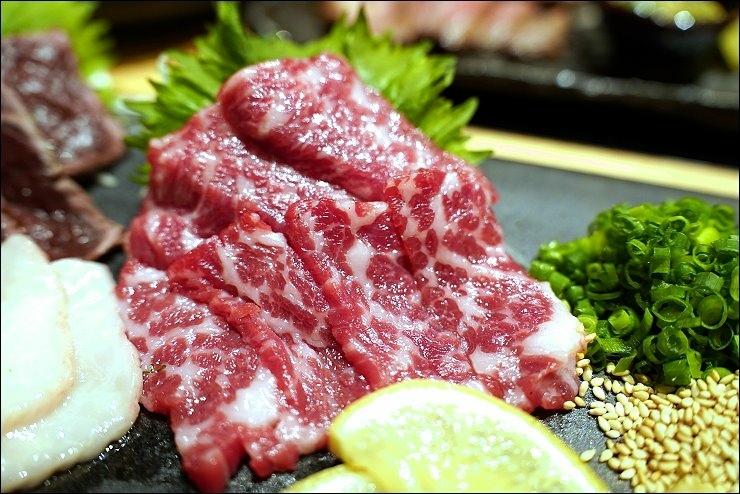 生馬肉拼盤,最左的是馬腿部瘦肉,微炙過,雖然是瘦肉但口感是軟嫩的/白白的是馬脖子後方的膠原蛋白,聽說吃了可以補充女生很需要的膠原蛋白,吃起來很有油香味,但有點太大塊要咀嚼很久,若能切小塊一點可能會比較好吃;最吸睛紅嫩嫩的腹部馬五花肉最好吃!