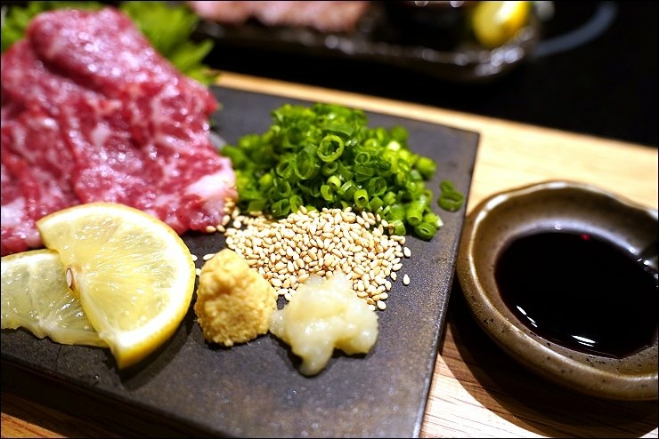 可以依自己喜好搭配黃檸檬、薑末、蒜末、白芝麻、蔥花及醬油。腹部馬五花肉非常有彈性,吃的到肉的新鮮,細細品嘗肉甜味兒。
