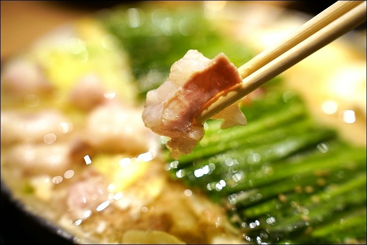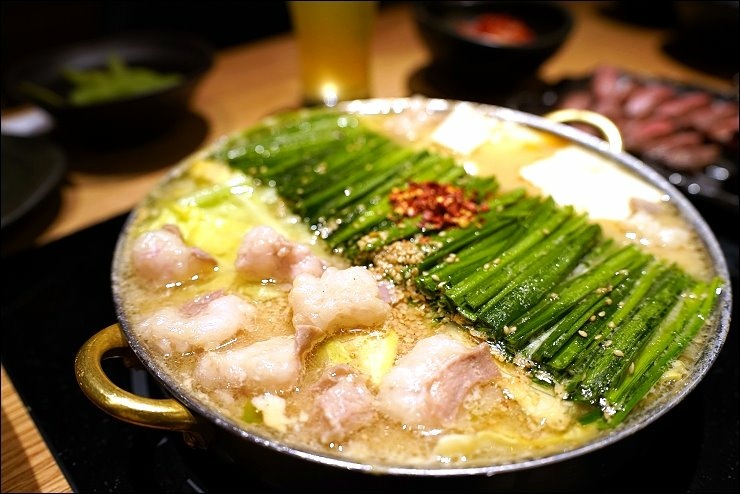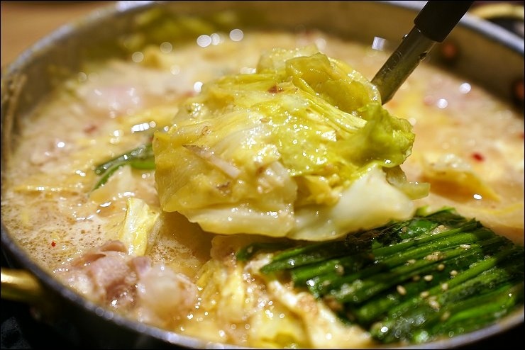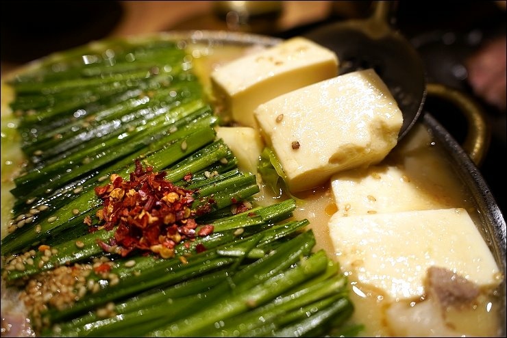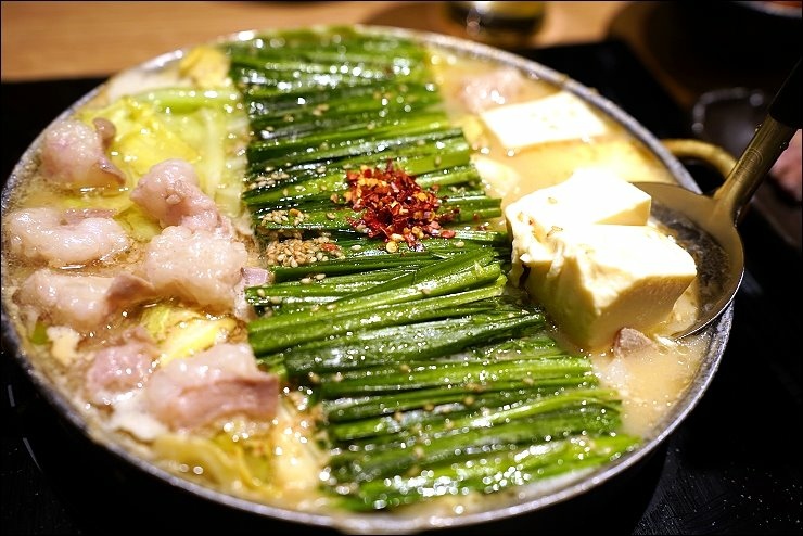 牛腸鍋(もつ鍋)的湯底有味噌、醬油及雞肉水炊三種湯底擇一,我們選人氣最高的味噌湯頭,味噌是店家特製,外頭吃不到這樣的味道,這鍋牛腸鍋是二人份。大山牛腸鍋會有一整排韭菜,也有撒上白芝麻增加香氣及辣椒提味,滿滿牛腸與濃郁的味噌湯頭,上桌的牛腸鍋裡頭的配料都煮熟了,只有最上層的韭菜舖上去還沒熟,建議用湯匙把韭菜往湯裡頭壓一壓,再煮個3分鐘左右就可以開動啦!