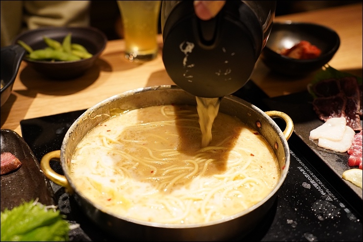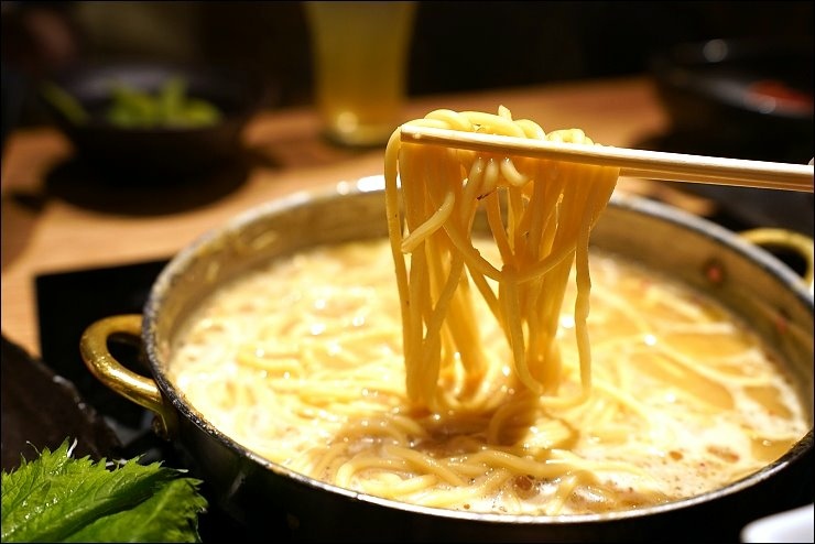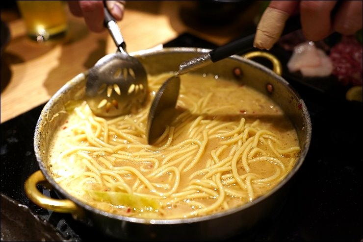 餐後強棒麵!大喀牛腸鍋之後用強棒麵收尾,麵條已經有煮熟過,下鍋後稍微加熱就可以享用啦(店家會視情況幫忙加湯),麵條吸附濃郁的味噌醬汁,吃的到牛腸的油脂味,想不飽都不行!