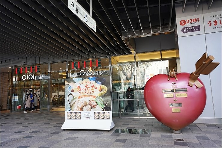 KITTE 博多是與博多車站共構的,它有地下三樓跟地上11樓的商場,1-7樓是博多0101百貨、8樓是UNIQLO、9樓10樓是餐廳,牛腸鍋大山もつ鍋おおやま是在KITTE博多9樓,很多人都會來KITTE旁的愛心郵筒集合順便拍照,這不是展示用的,是真的郵筒,還有適合小孩身高的投遞孔。